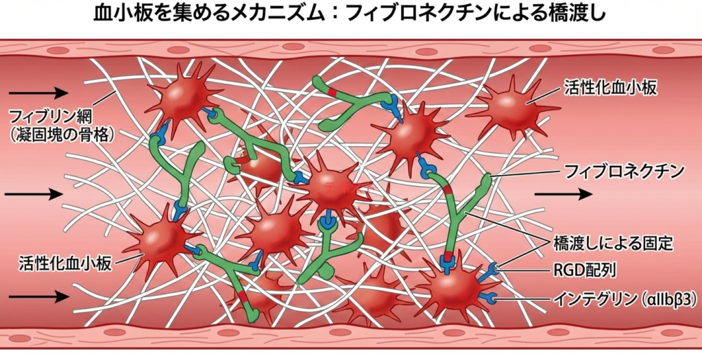 同時に、フィブロネクチンは別の場所にある「細胞結合ドメイン(RGD配列)」を使って、活性化した血小板表面のインテグリン($\alpha_{IIb}\beta_3$など)と結合します。 - 橋渡しによる固定