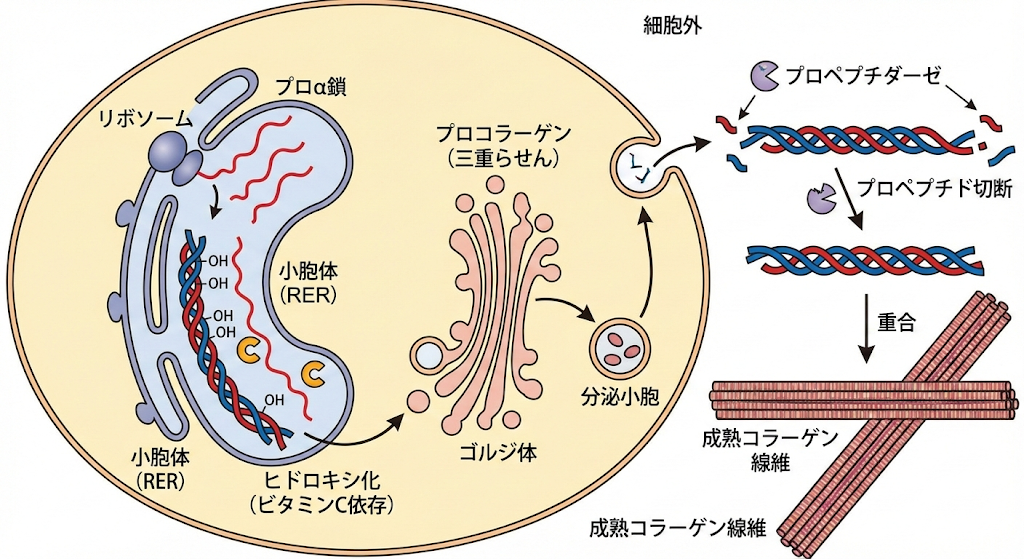 線維芽細胞内でリボソームでプロα鎖が合成され、小胞体でプロリン・リジンがビタミンC依存的にヒドロキシ化されます。3本鎖が三重らせんを形成したプロコラーゲンがゴルジ体から細胞外へ分泌され、プロペプチダーゼで末端が切断されて成熟コラーゲン線維が重合します。